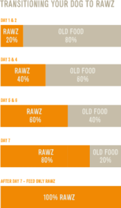 To transition, gradually mix in the new food over a 5-7 day period, increasing the amount of RAWZ® each day, so that you are feeding 100% RAWZ® by day 7.