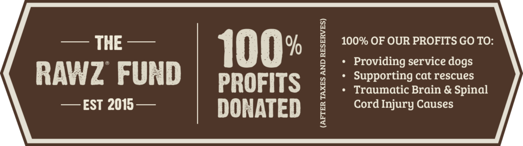 At the heart of RAWZ is our love of animals and our personal promise to give back. So while you’re providing your furry companion with exceptional nutrition, you’re also helping to support cat rescues, care for survivors of traumatic brain and spinal cord injuries, and provide service dogs to those in desperate need. That’s because we donate 100% of RAWZ Natural Pet food profits (after taxes and reserves) to incredible organizations like these.